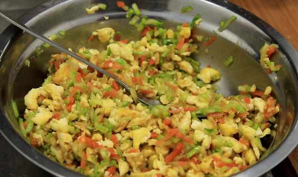 4、将西葫芦和胡萝卜取出用手挤干水分,放在案板上切开,和鸡蛋一起放,加入鸡精1克,蚝油3克,十三香1克调料、香油3克,用小勺拌匀,调好口味。