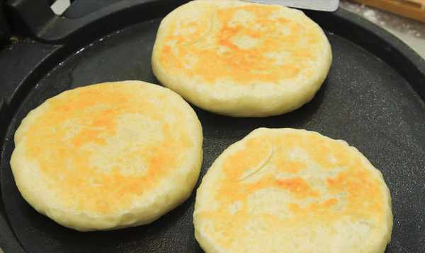 6、取出电烤炉,开机加热。平底锅烧热后,刷上植物油,将蛋糕放在电烤盘上,在蛋糕表面抹上一层植物油。一面煎至金黄色,然后翻面煎另一面。来回翻动几下,煎五六分钟。炸至表皮金黄酥脆,捞出食用。
