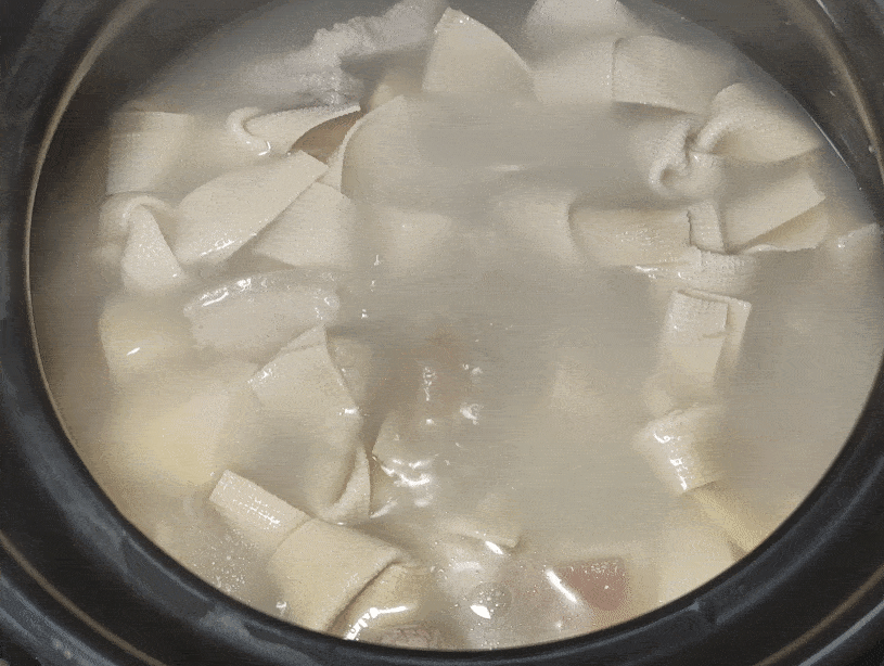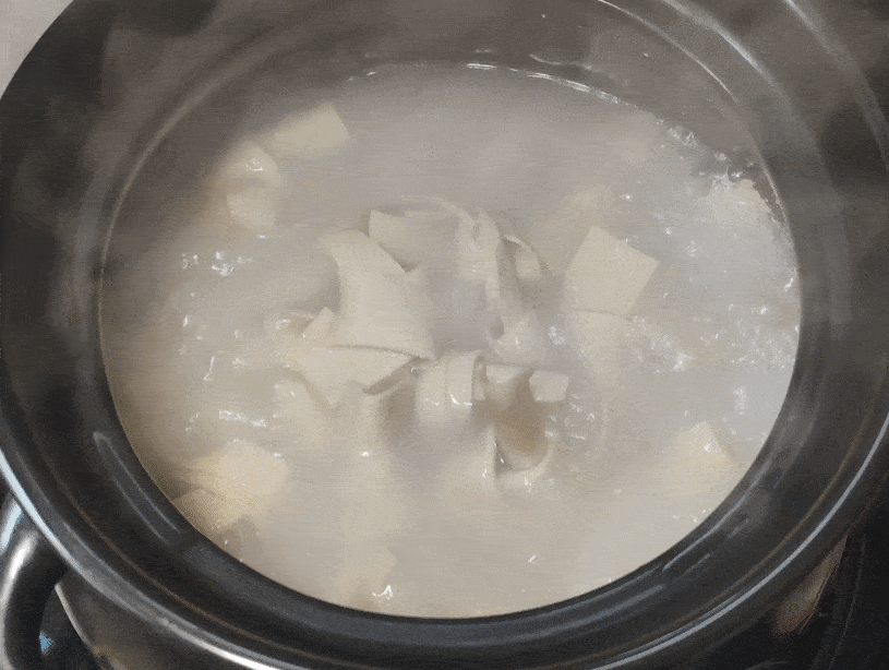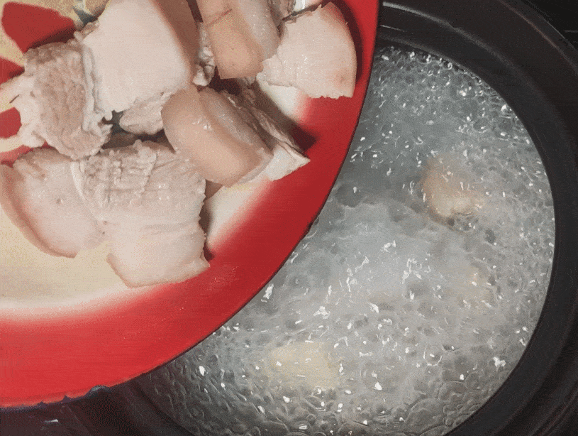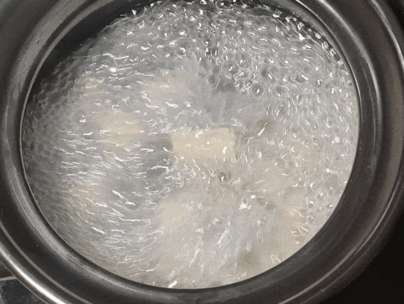 当汤稍微沸腾时,将其恢复为小火并慢慢倒入。煮约半小时后,即可打开锅盖,捞出汤汁中的油脂和污垢。