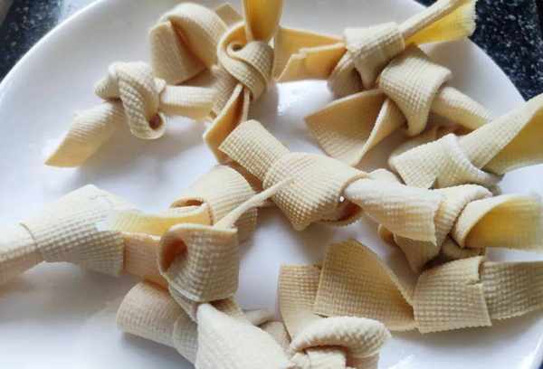 将百叶用清水浸泡软化,逐条裁剪,剪成条状,打结。