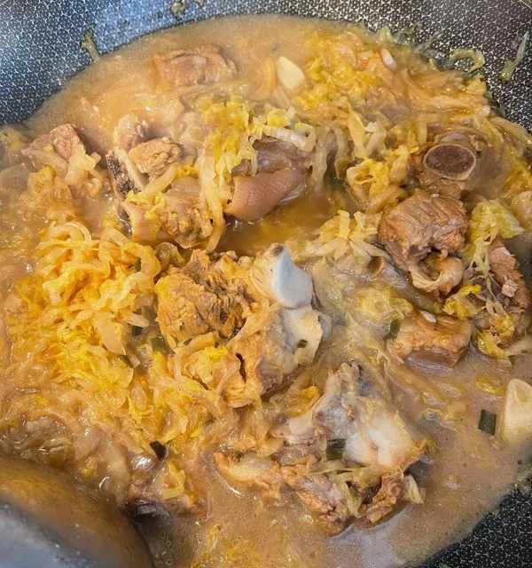 酸菜500克、大猫骨2根、葱1片、姜2片、蒜2瓣、八角1颗、干辣椒(依个人口味)、料酒1勺、生抽1勺酱油、大酱一勺、蚝油一勺、十三香适量、盐按个人口味