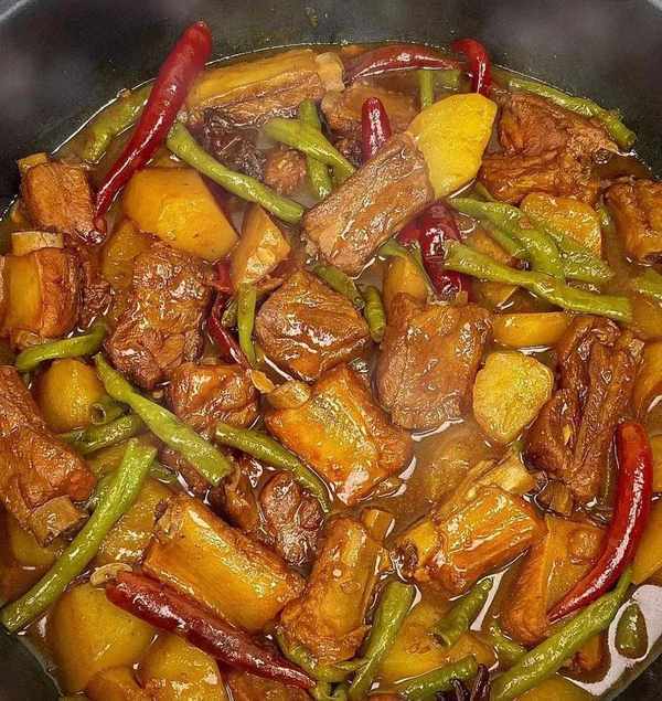 排骨、豆角适量、盐一茶匙、油适量、葱1片、姜2片、蒜头3瓣、老抽1勺、八角1粒、生抽1勺料酒、糖1勺