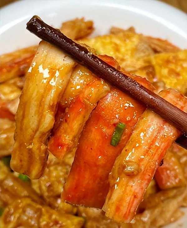 3.将蟹棒炒软,然后将鸡蛋倒入酱汁中搅拌均匀。最后撒上一些葱花就可以出锅了。