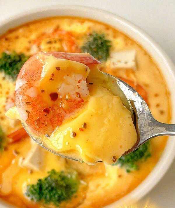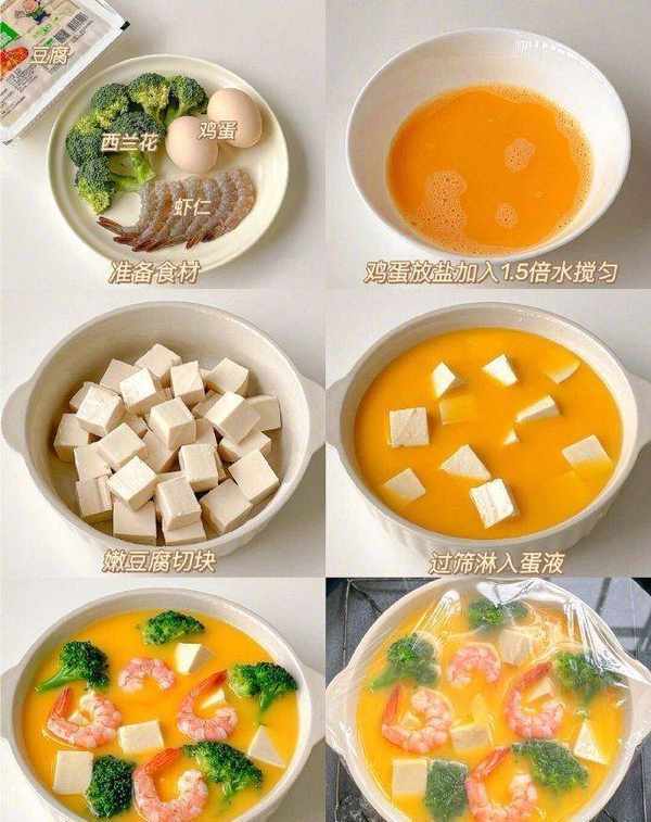 2、西兰花和虾仁焯水,软豆腐块放入蛋液中,西兰花和虾仁放入碗中,盖上保鲜膜扎几个小孔,冷水蒸18分钟左右。