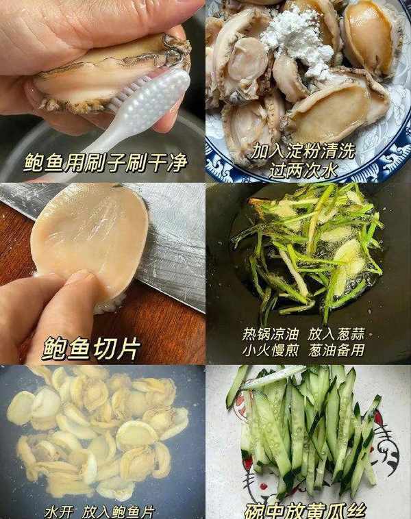 1、【葱油鲍鱼片】准备材料:鲍鱼、小葱、蒜头、黄瓜、红辣椒。