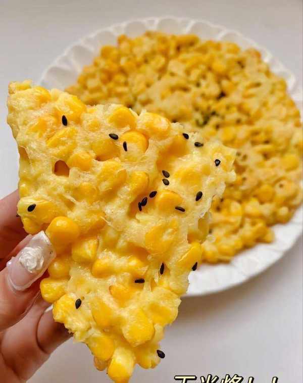 3.在平底锅中加热油。油热后加入玉米粒糊。开小火慢慢煎。煎至一侧凝固,然后翻转并继续。煎至两面金黄。点黑芝麻和白糖,味道更甜。
