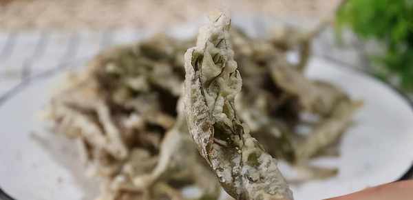 4。将焯水的香椿放入面糊中,裹上一层面糊;