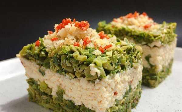 5.准备一个模具,底层放豆腐,顶层放香椿粉,层层叠压;