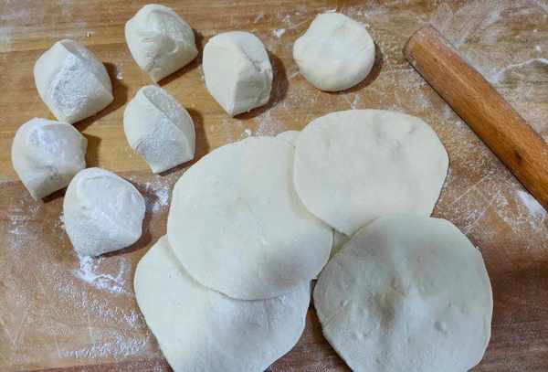 7.面板上撒干面粉,倒入面团中搅拌去除大气泡,然后揉成粗条,切成等份,压成中间厚边稍薄的圆形面团