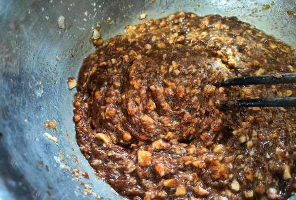 2.调整肉馅。肉馅不要直接搅拌,必须先加入一小碗水的1/3,用筷子搅拌,直到水被肉馅吸收。然后加入适量的葱姜末,料酒3汤匙,酱油适量,花椒粉半汤匙以上,十三香半汤匙,植物油适量,2汤匙芝麻油和3汤匙盐。用筷子不断搅拌,直到肉馅变软变粘。
