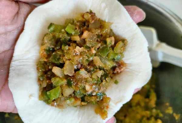 8.取面团,放入馅料,再加馅料,用勺子压一下,放入。