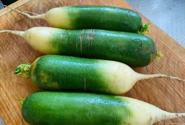 3、萝卜,我用的是一串又长又绿的萝卜。也可以根据家里有的做,比如扁萝卜白萝卜