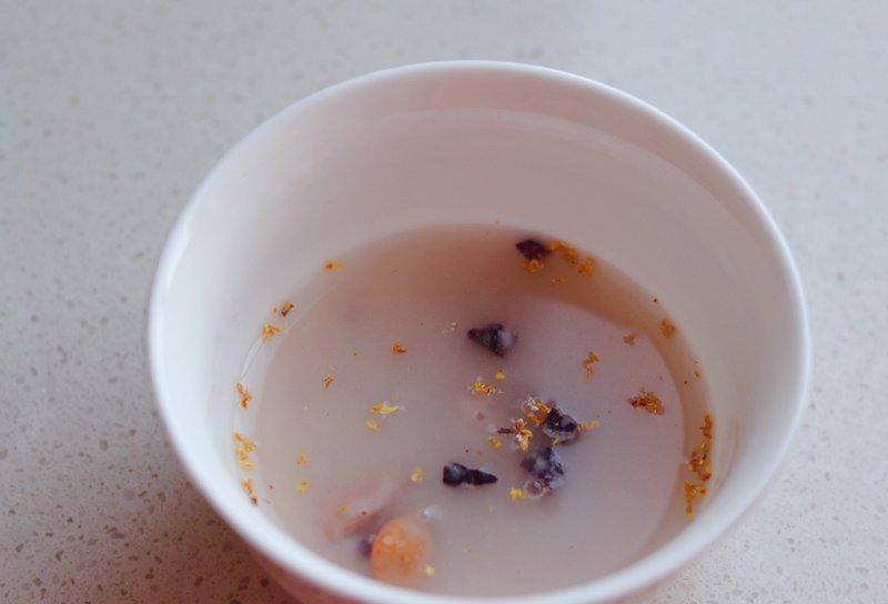 4.将淀粉放入碗中(如果有藕粉就用藕粉),加少许凉水,一定不要加太多,在汤圆里加入少许红Pappu,搅拌均匀同时添加以查看它的厚度。然后撒上一些桂花就大功告成了。