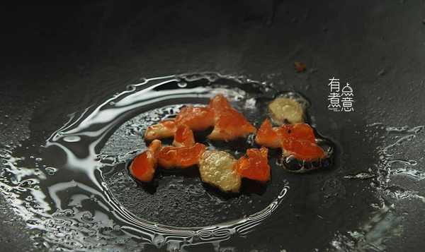 首先,锅里放少许油,将咸蛋黄和蛋白分开,蛋黄切块倒入锅中用小火煎片刻,至蛋黄呈油状。