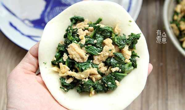 在发酵好的面团中加入两汤匙花生油或玉米油,短暂混合以释放空气,然后分成小球。将面团揉成圆形压扁,用擀面杖擀薄,中间放上馅料,收口轻轻压扁。
