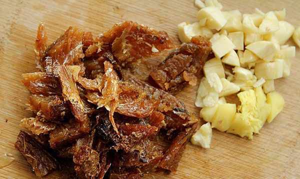 开罐后,用筷子夹出香肠,沥干油切块,不要太小。大蒜被压碎切成小块,生姜也被压碎以提味。