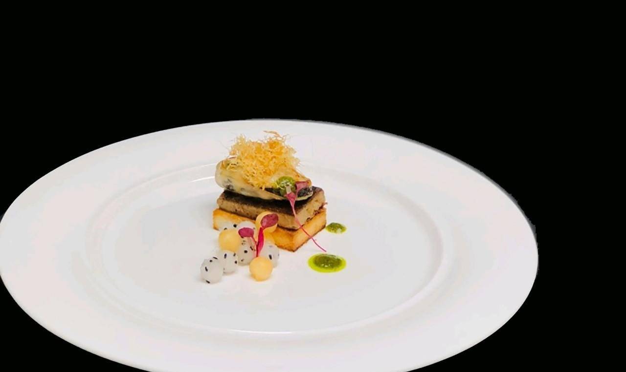 将方形包子切成块,烘烤至酥脆。冷却后的鸭肝切块,加入橄榄油,炸至表面金黄,摆成方形,放入煮好的贻贝。
