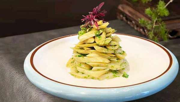 将加工好的竹笋和香椿芽加入香料中,拌匀后装盘。
