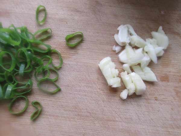 第二步:把葱和大蒜改刀备用。