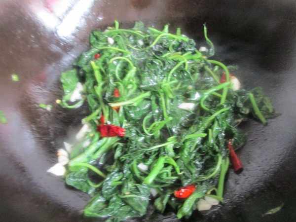 第四步:倒入苋菜煸炒均匀,然后中火多炒一会,苋菜如果炒的时间太短会发硬不好吃,多炒一会会口感特别的爽滑。