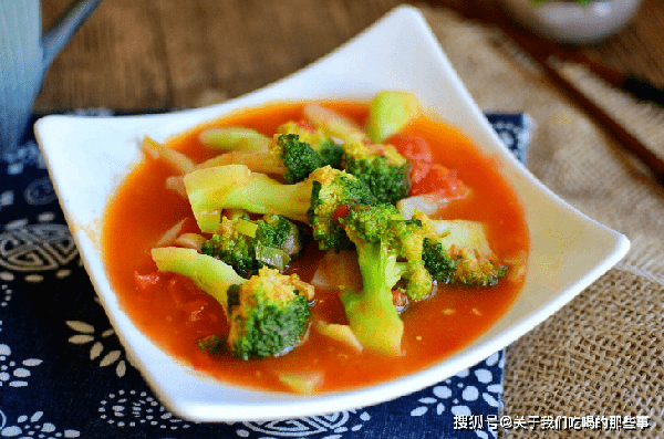 2、起锅烧油,放入葱姜蒜爆香,放入西红柿块,小火煸炒出西红柿汁。倒入西蓝花,加入适量盐,大火翻炒1分钟,让西蓝花裹上一层番茄汁,倒入水淀粉勾芡,汤汁浓郁后即可出锅。
