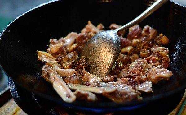 1、用生抽、姜、糖、酒等腌制鸭肉半小时以上。将偏肥的鸭肉先下锅,煸出鸭油,然后开大火,将其余鸭肉下锅,炒至金黄。
