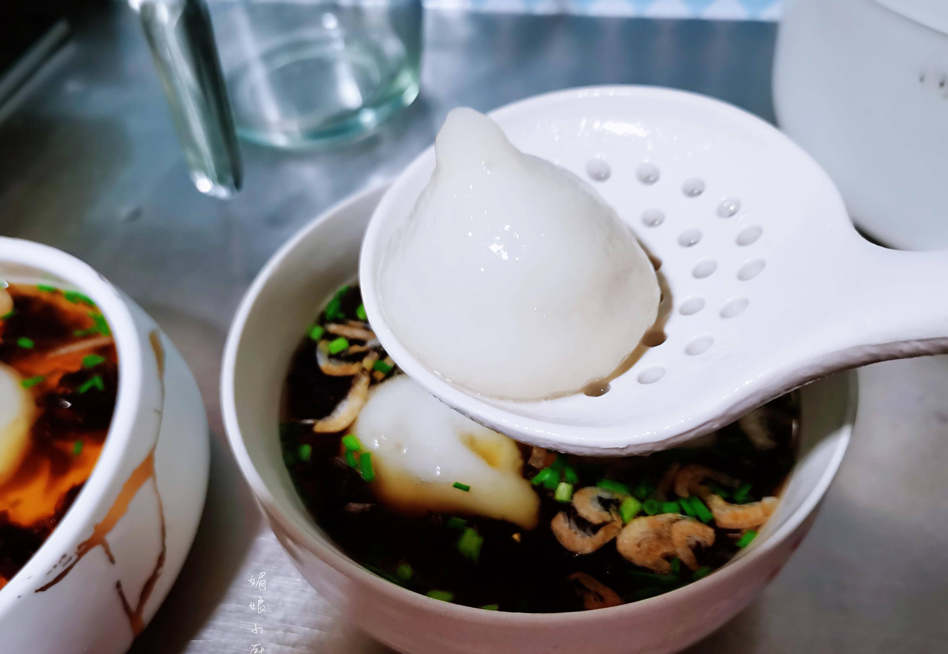 7、再将煮好的汤圆用漏勺从锅中捞出下入汤碗里即可。最后根据自己的口味添加米醋,点几滴香油,喜欢辣的再加一勺辣椒酱,鲜美软糯的咸味汤圆就可以享用了。