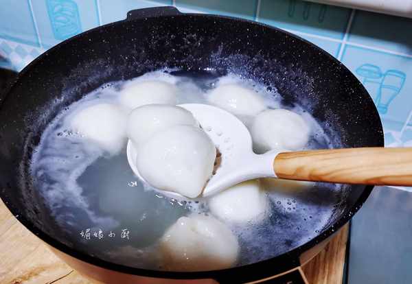 5、煮汤圆,锅加水先烧开,再放入做好的咸汤圆,下锅后马上用勺子轻轻地推几下让水流动起来,汤圆便不会下沉粘锅底,接着把火调小一点,保持锅内微沸腾的状态,盖上锅盖煮2--3分钟,汤圆煮至浮起便调成小火,加入少量冷水煮沸,再次加入冷水再次煮沸,馅料煮熟透