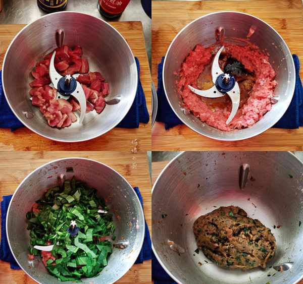 2、猪肉切小块再用料理机搅打成肉馅,再搅拌至有黏性,肉馅抱成团,然后加入料酒,生姜水,蚝油,盐,蘑菇鲜味粉,胡椒粉搅拌均匀,接着加入油菜叶子(只用软的叶子,梗子不要)搅打混合均匀,最后加入一汤匙食用油拌匀,馅料就做好了