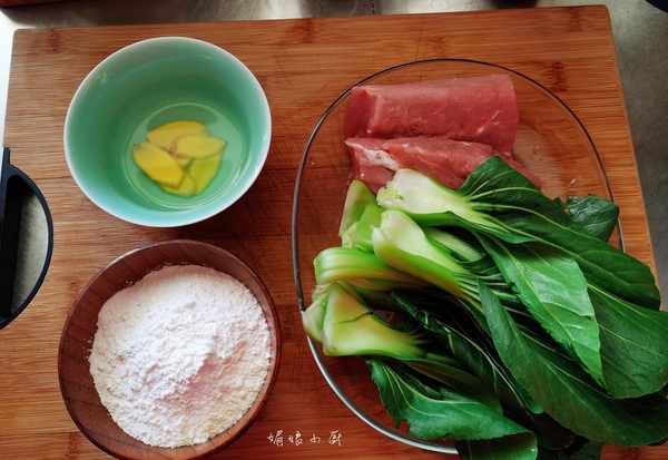 食材:糯米粉1小碗,里脊肉250克,油菜2棵,生姜5片,料酒2汤匙,蚝油1汤匙,食用油1汤匙,盐,蘑菇鲜味粉,胡椒粉,生抽,小葱,紫菜,虾皮,米醋,香油