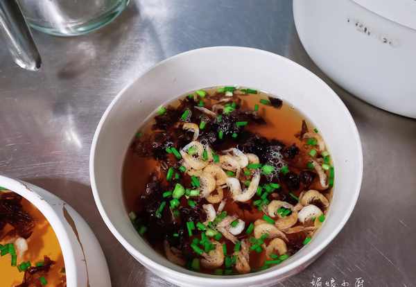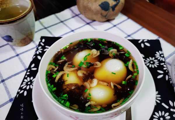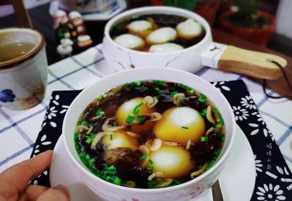 6、调汤水,碗里放入一小撮紫菜碎、淡虾皮、生抽、一点点盐、葱花,冲入半碗煮汤圆的水(想要汤水清澈些就用开水,想味道更鲜就加鸡汤或排骨汤)