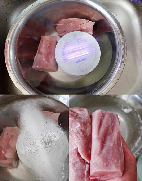 ☆ 做馅的肉不能焯烫去除血水,我便用大宇无线果蔬卫士清洗机来清洗,能有效地去除肉里的血污,不需要添加剂,只将水电解生成氢氧离子,从而对起到降解农残,净化杀菌的作用。
