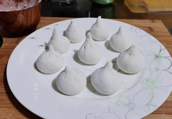 做好的样子。我这个是用一只手的虎口一点点将面皮往上提拉最后捏紧留着小尖尖。也可以将面皮对折边缘捏合就像饺子一样。