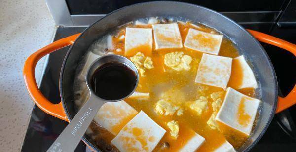 第十步:加入1勺生抽搅匀,再次把汤汁煮至沸腾。