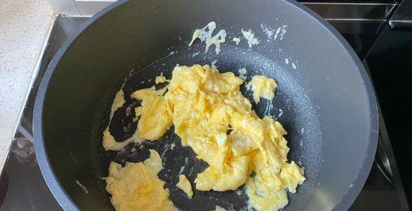 第四步:鸡蛋液加少许食盐打散,炒锅放入少许植物油,倒入打散的鸡蛋液,炒至蛋液凝固结块后,盛出备用。