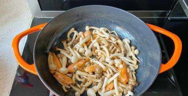 第六步:把沥干水的菌菇,倒入锅里,和虾油一起翻炒拌匀。