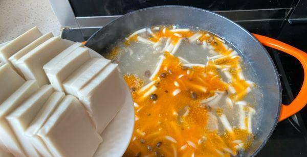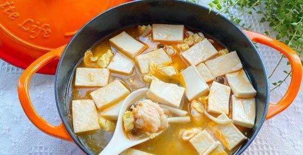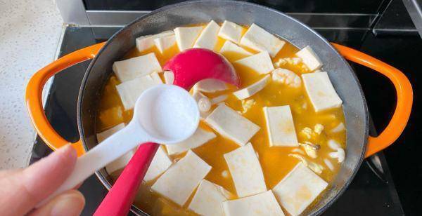第九步:沸腾后打开锅盖,把虾仁、豆腐、鸡蛋,全部放入汤锅。