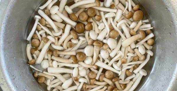 第三步:白玉菇和蟹味菇清洗干净,放入热水中焯水片刻,捞出沥干水分备用。菌菇类焯水可以去除土腥味。