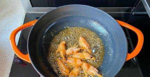 3、虾头煸炒的时候,要用锅铲按压虾头,这样才容易把虾油煸炒出来。