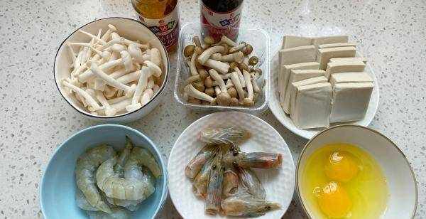 【食材】:鲜虾8只,鸡蛋2个,白玉菇150克,蟹味菇150克,千叶豆腐180克,料酒1勺,生抽1勺,黑胡椒粉1勺,植物油少许,盐少许,清水适量