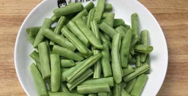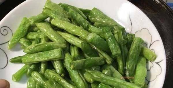 3,放入豆角,加热油,煮沸油,油温烧伤至70%的热量。添加豆角,炒到豆角,皱纹变得柔软,可以拆下锅。