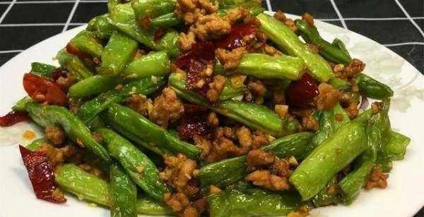 4,其他罐子会用小油加热并将其放入碎肉中。将烹饪葡萄酒添加到痰,生大豆储蓄,胡椒粉。当肉被搅拌干燥时,大蒜的末端,干辣椒,姜爆发。然后加入豆角,糖清新,搅拌盐均匀。