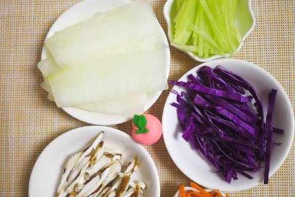 1、冬瓜、莴笋去皮切薄皮,香菇清洗干净切丝、胡萝卜去皮清洗干净切丝、紫甘蓝切丝,备用;