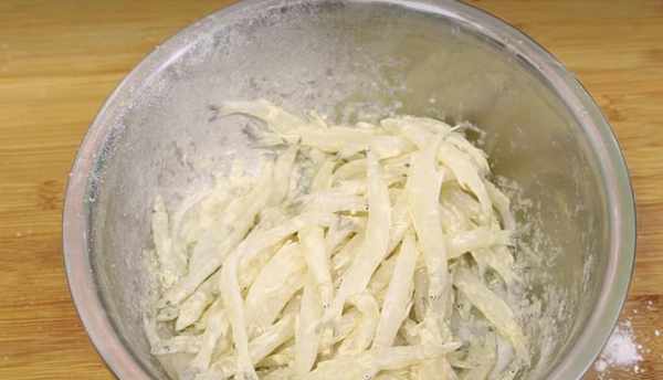洗完澡,沥干水,加入适量胡椒粉,泡打粉3勺,玉米粉1勺,冲洗干净,干湿程度如下图即可,不要太湿,不要太多。干的,这是找不到干粉的状态,最好,炸的最弱。