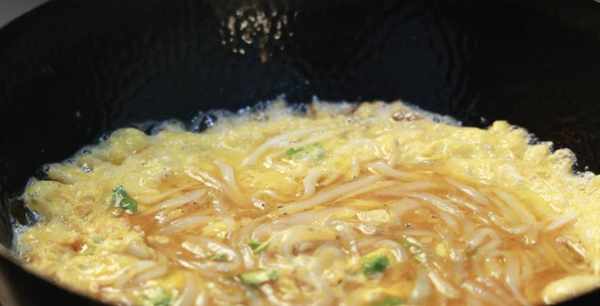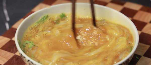 平底锅置中火,加入一勺熟酵母,加热至80%,倒入鸡汤,然后慢慢转动平底锅,让蛋液散开。