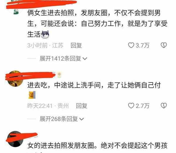 有网友评论说,这两个女生进去以后拍照发朋友圈,不仅不会提到男生,可能还会说,自己努力工作,就是为了享受生活。
