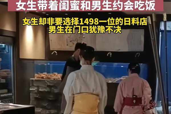 江苏某地一女子带着闺蜜和男生约会,到了吃饭时间直奔日料店,1498一位的价格把男生吓坏了,犹豫半天到底还是进去了。