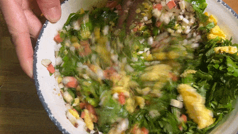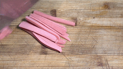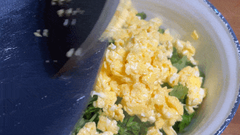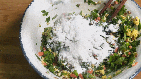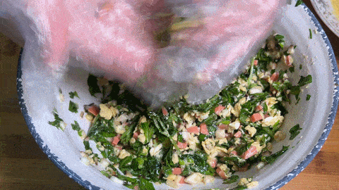 3、 火腿肠切成丁,和芹菜叶、香菇丁、鸡蛋碎一起调成馅料