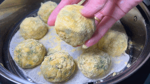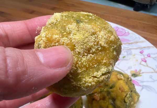 15. 带着一次手套,将馅料攥成团,放入玉米面中裹一层