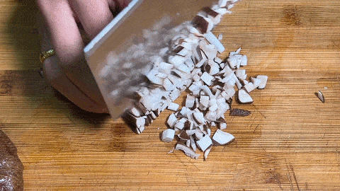 2、 香菇洗净去蒂切成香菇丁,鸡蛋先炒成鸡蛋碎